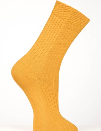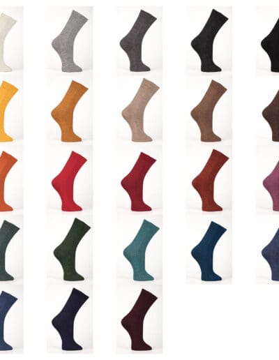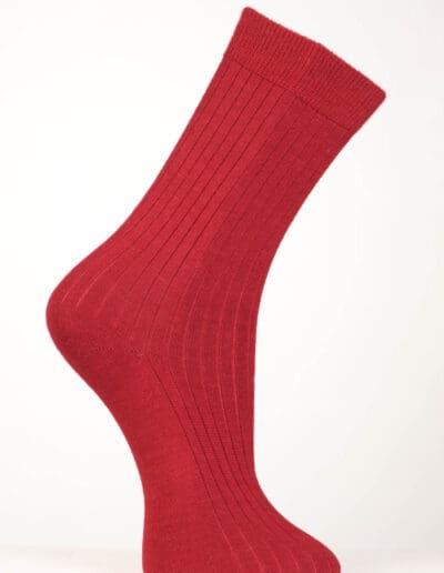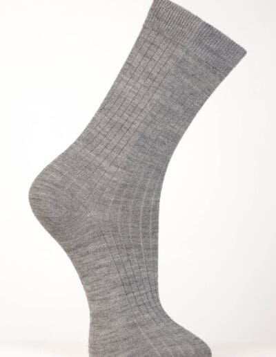 Sock­en in Rip­pen­strick mit Bünd­chen. Wun­der­bar dünn und doch wär­mend und sta­bil. Diese Sock­en wur­den aus einem Alpa­ka-Merinog­a­rn um eine Nylon­seele gestrickt. Dieses Nylongewebe dient als Stütze und beugt Löcher­bil­dung vor.